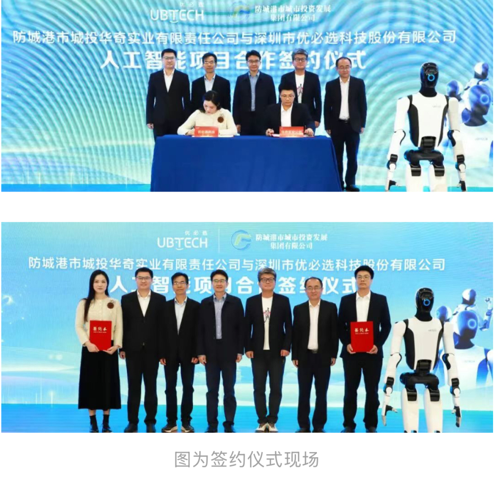 随后,防城港市华奇实业公司董事长吴卡宁与优必选科技政企合作负责人肖佳代表双方企业,正式签署合作协议。